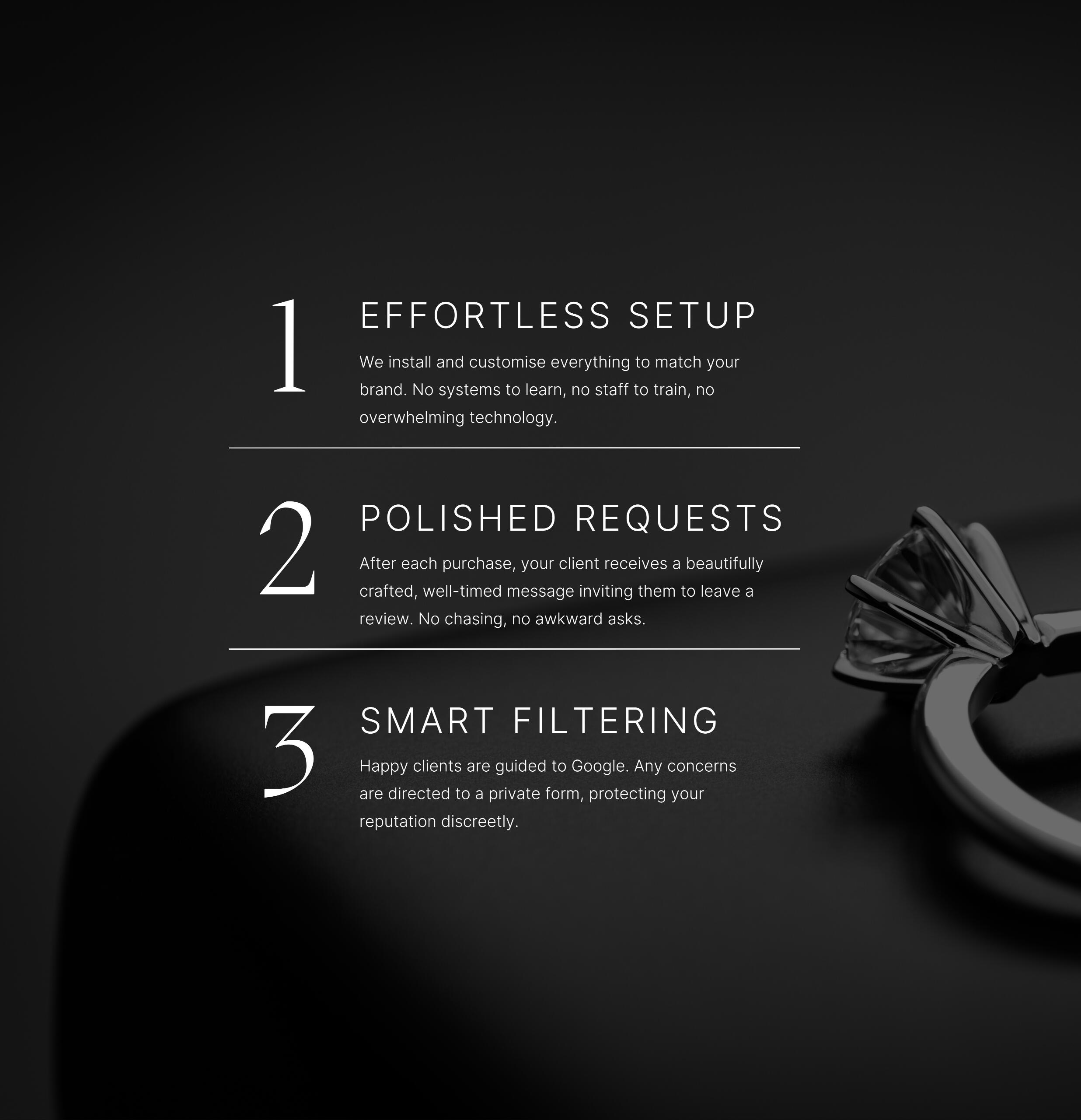 TrustBuilt handles it all for you. After each purchase, your clients automatically receive a bespoke review request. Happy customers are sent directly to Google to share positive feedback, while any negative comments go to a private form, keeping your reputation intact. Every message is tailored for jewellers. You focus on your craft - we’ll take care of the rest.