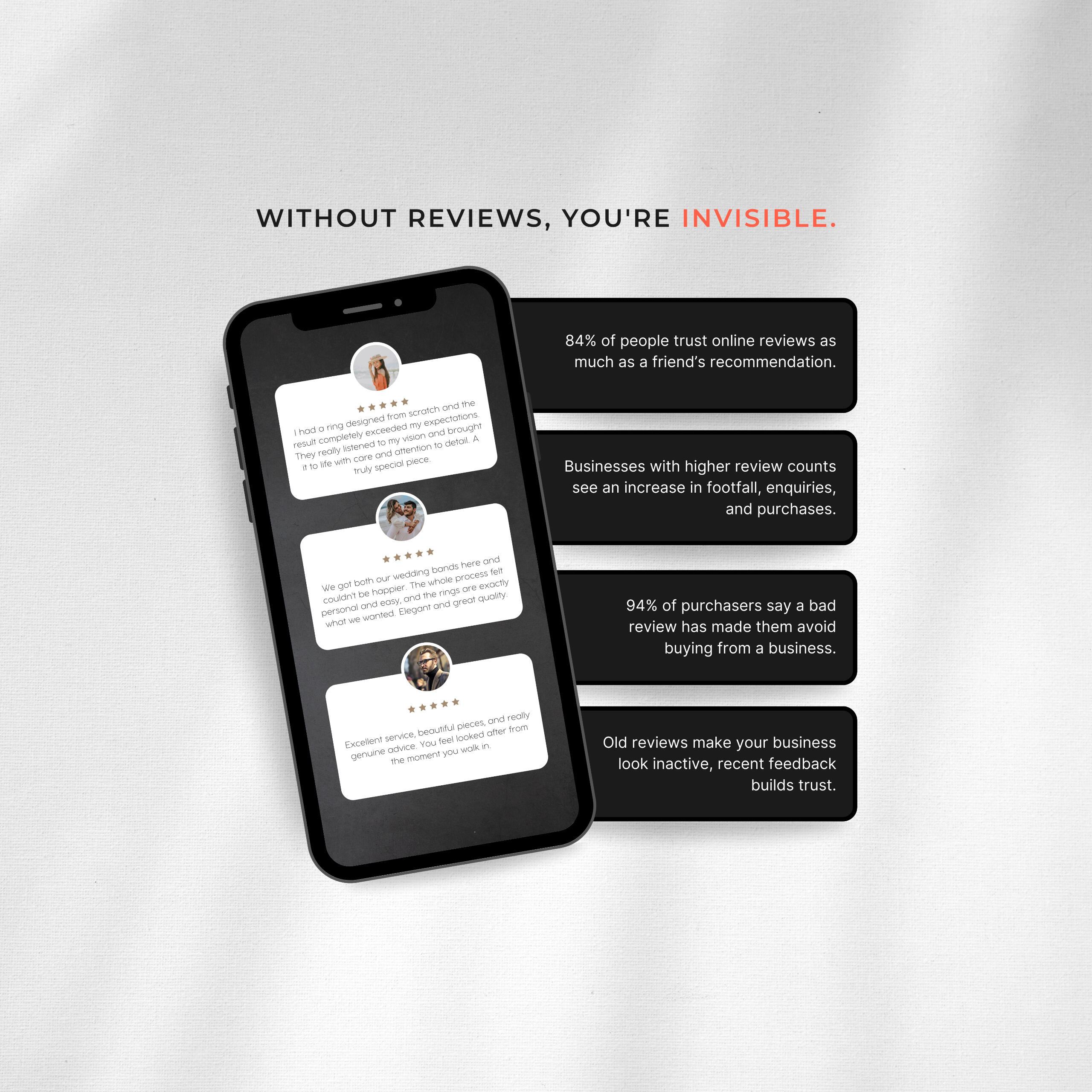 Other platforms blast every customer automatically, but that’s not how jewellers work, and it’s not how we work either. You know your clients personally. Some purchases are sensitive, private, or simply not right to request a review for. That’s why you stay in control through your branded Review Drop-Off Form, quick, discreet, and selective.