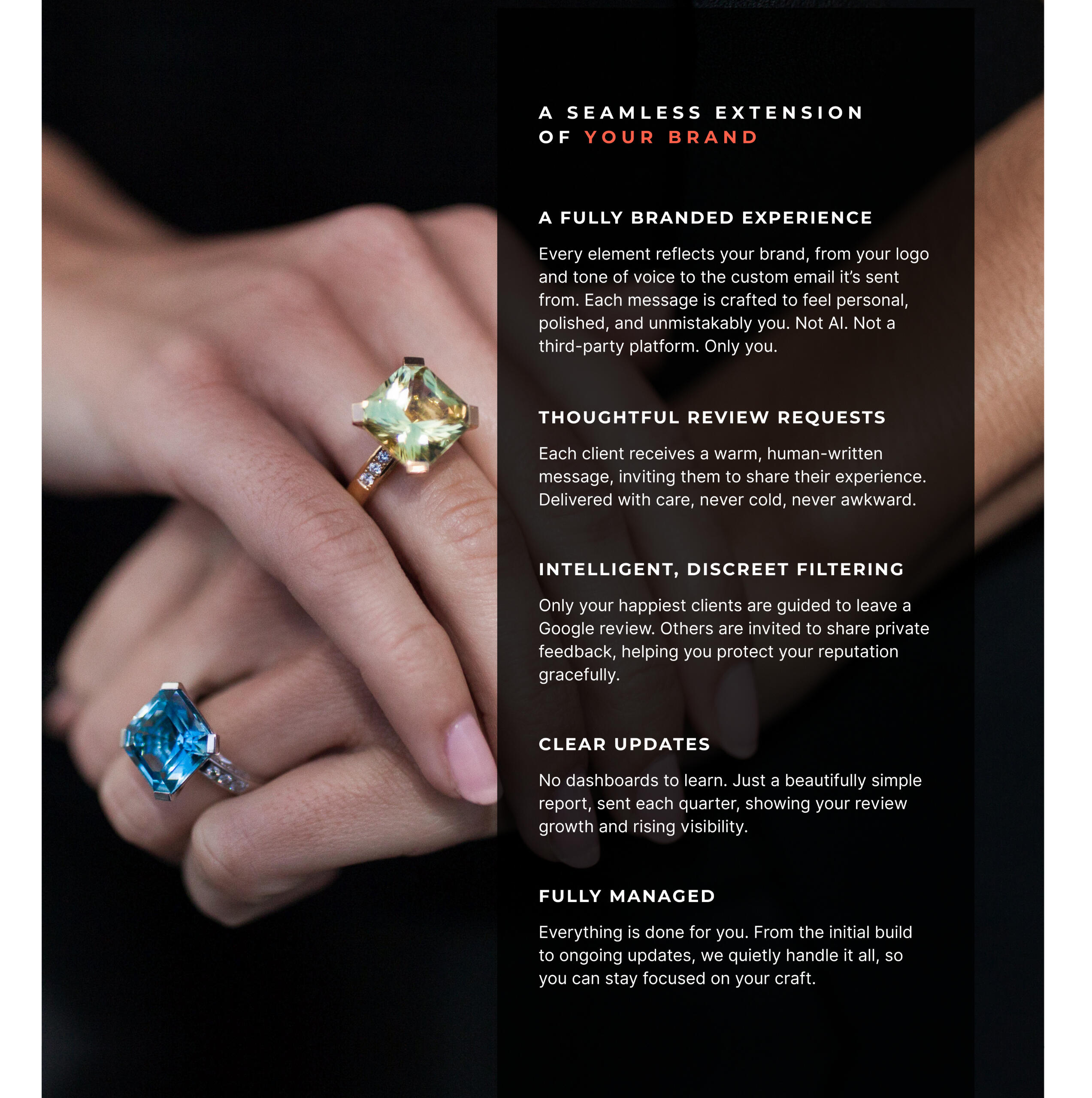 In the world of fine jewellery, trust is everything, and today, that trust starts online. No matter how beautiful your pieces are, without strong Google reviews and jewellery review management, potential clients may never reach out or visit. TrustBuilt helps jewellers build trust, stand out online, and attract more clients at the exact moment they are choosing who to trust with their most meaningful purchase.