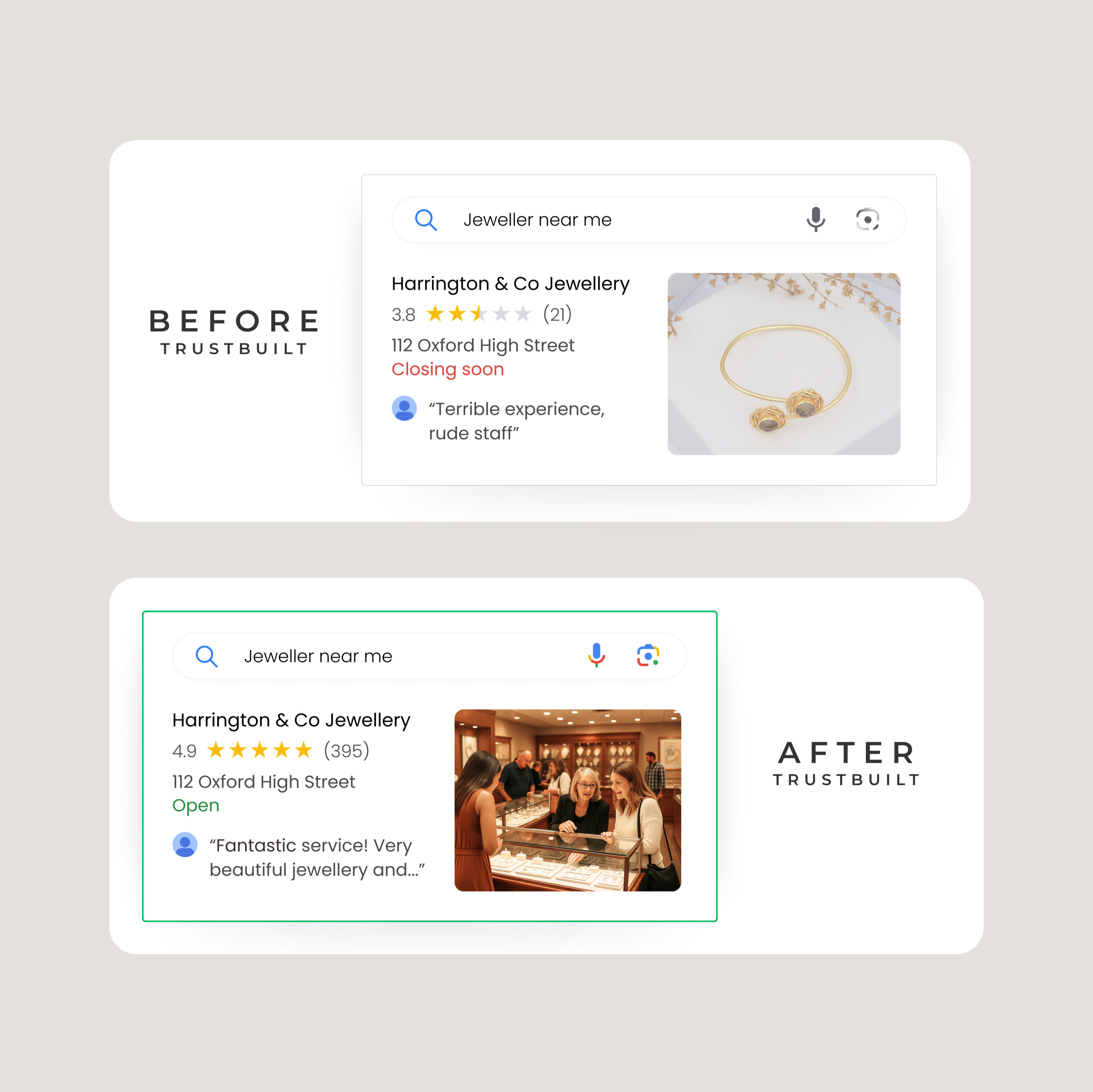 TrustBuilt focuses on quality, not volume. While results vary, jewellers typically receive more thoughtful, experience-led reviews that better reflect the care and expertise behind their work.